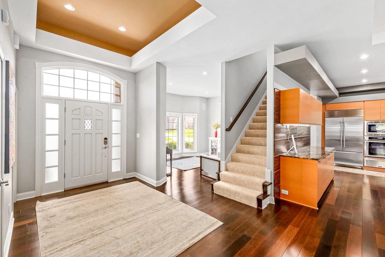 Set on a park-like lot, this beautifully remodeled home is bright, private, and inviting. A grand foyer with soaring ceilings opens to an entertainer's dream kitchen and living space featuring Sub-Zero and Thermador appliances, a wet bar, and elegant finishes. Sunlit living areas, skylights, and wood floors flow to dining and patio spaces. The first-floor primary suite offers a private patio, plush finishes, and a spa-like bathroom with dual shower with heated floors. Upstairs includes two spacious bedrooms, full bathroom, and office space. The finished basement adds living and entertaining areas. Smart home CONTROL4 tech, new water heater (25), EV-ready heated garage, all meticulous upkept, complete this move-in-ready retreat near parks, and dining.