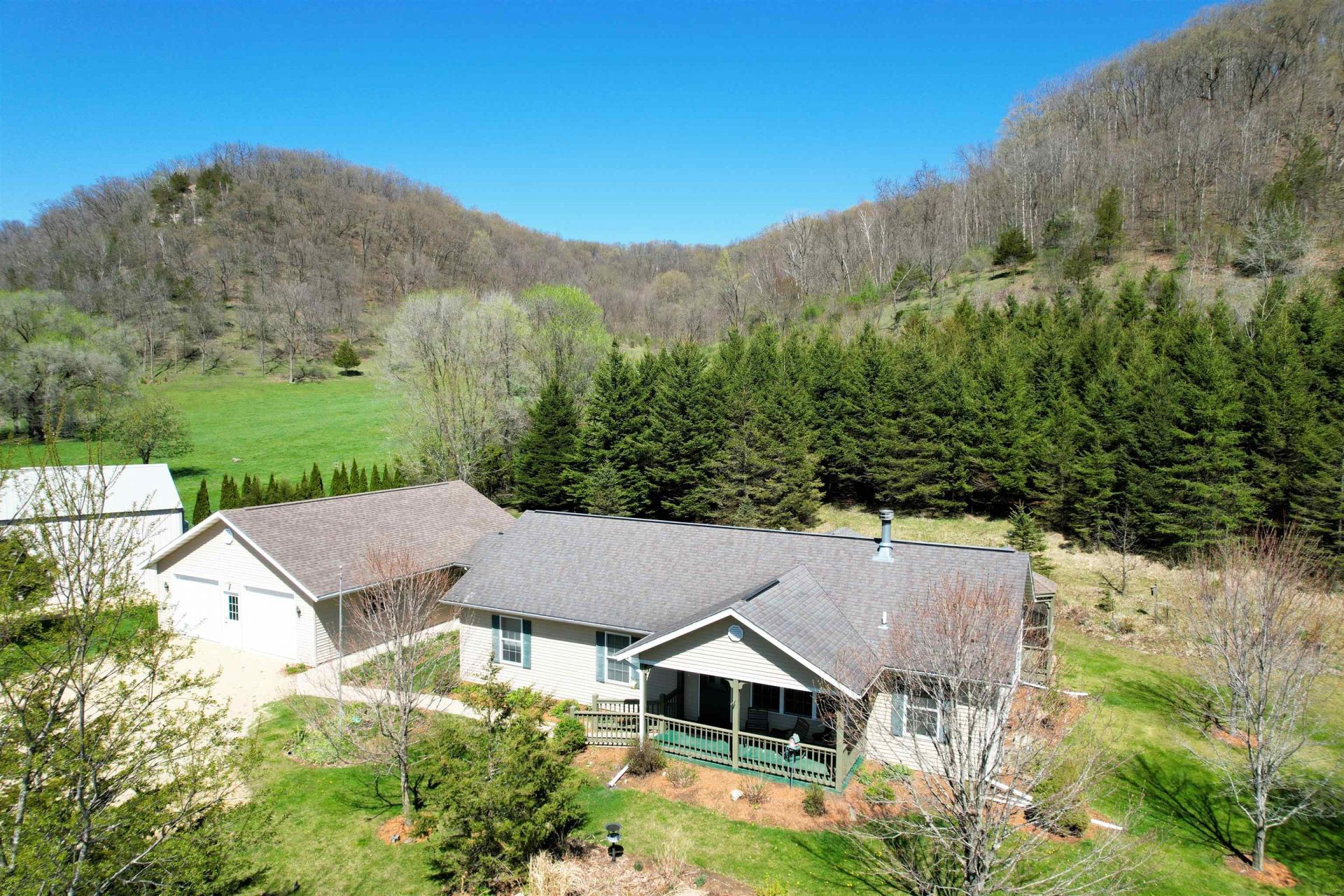 Cozy Country ranch style home on a full poured concrete basement with oversized 40x27 garage plus a 56x32 shed with full concrete floor on 19.85 +/- acres. Well situated within a scenic rural Driftless Region valley just a short walk to Class I & II trout streams, this property has a 3.5 acre open field, a 1 ac potential pasture area with shade trees, plus over 13 acres of hardwoods and pine with a utv/atv trail to the hill top with a commanding view of the West Fork Knapp Creek Valley. Located in Crawford County near the Richland County line 22.8 mi west of Richland Center, 13.4 mi to Boscobel, and 27 mi to Viroqua WI.
