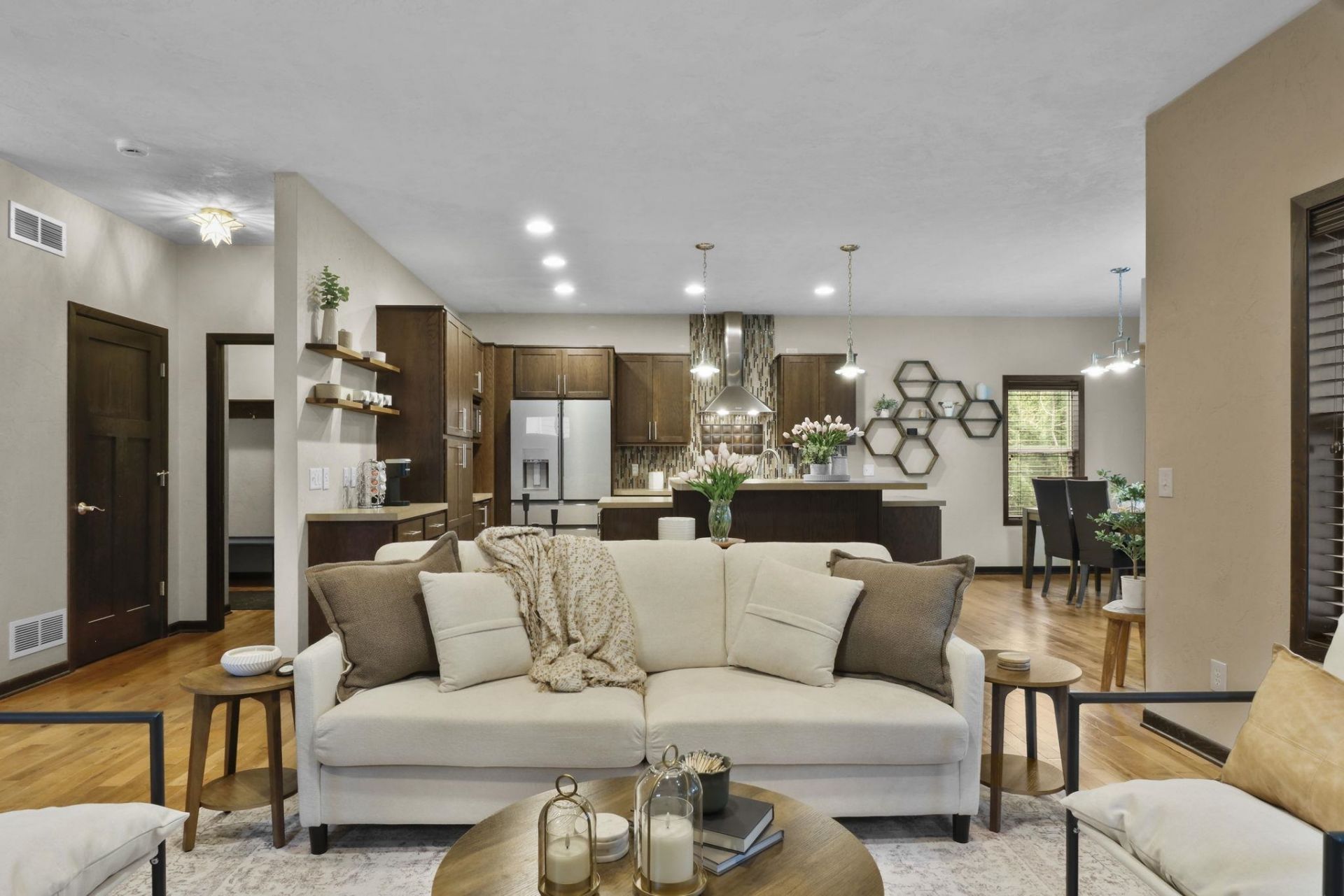 Don't let the 2-car garage fool you, this one fits 3, or use the extra space for a workshop or storage. The main level features an open kitchen with newer Caf fridge & range and Bosch dishwasher, breakfast bar, and a large dining room made for hosting. Cozy up to the gas fireplace in the living room, or step outside to a covered patio perfect for grilling, backed by a private treeline and low-maintenance yard. Head downstairs where the lower level truly sets this home apart, a bonus 18x28 exercise/theatre room created from the Spancrete garage, separate family room space, full bath, and 8+ ft ceilings. Large primary suite includes a fully tiled glass walk-in steam shower. Furnace, AC, and water heater all new in 2024. Ramped/level entrance from both the front entry and mudroom. Just 11 minutes from Epic.